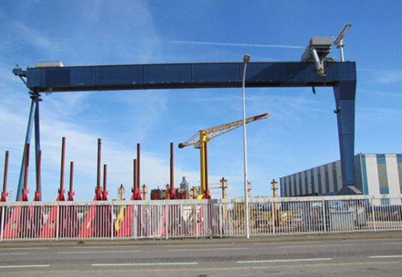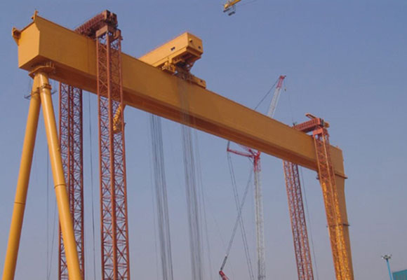 Dwudrzwiowa suwnica bramowa dla przemysłu stoczniowego to rodzaj suwnicy bramowej, która służyła głównie do cumowania złożonego kadłuba. Ten rodzaj żurawia stoczniowego ma funkcję załadunku i rozładunku, podnoszenia, segmentacji obracania powietrza. Mają tę zaletę, że obracają kadłub i zamykają operacje. Pierwszą z nich są korekty w górę iw dół, cały segment samochodem.