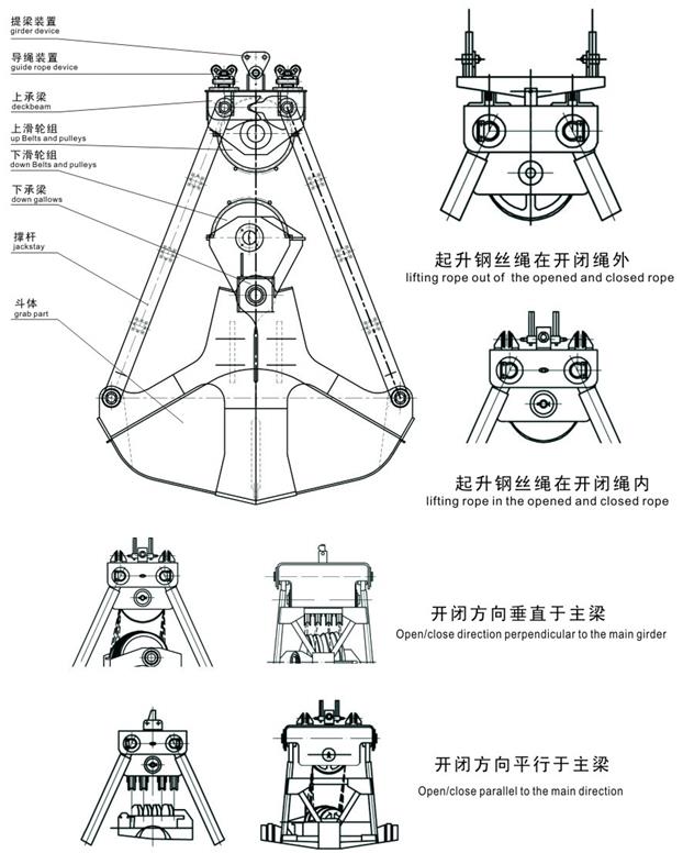 Rozpoczęcie pracy, podeprzeć linę będzie podnosić wiadro chwytaka w odpowiednim miejscu, a następnie wyłączyć linę nośną, polegać na ciężaru własnego belki w dół wymusić duży promień w dół środkowej otworzyć korpus chwytaka. Kiedy oba uchwyty nauszników rozbijają się razem, część chwytaka otwiera się maksymalnie. Podczas otwierania łyżki chwytającej zwiększa się odległość środkowego koła pasowego belki i koła pasowego w dół. Następnie lina podpory odłożona, otwarta łyżka chwytaka opada na przechwycone materiały powyżej i zapakowana wokół liny otwartej i zamkniętej, górne koło pasowe i dolna odległość koła pasowego wracają do pierwotnego położenia, tym samym kończąc chwytanie proces chwytania materiałów. W tym ostatnim czasie, podnosząc jednocześnie i otwierając i zamykając linę i linę nośną, cały kubeł chwytakowy podnosi się, zgodnie z dźwigiem, przesuń pojemnik chwytający na miejsce rozładunku, rozładowując materiały.